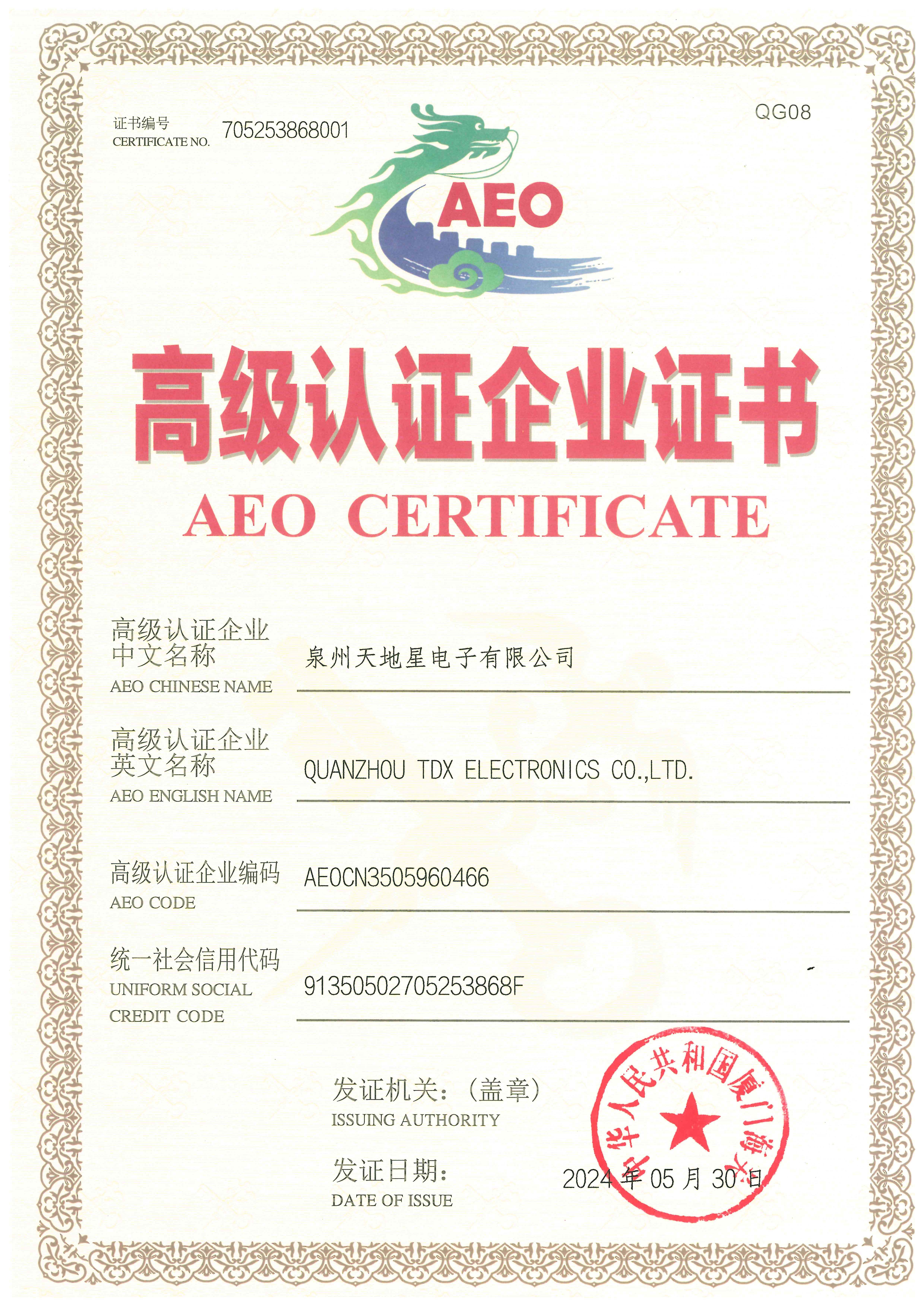 AEO海關(guān) 高級(jí)認(rèn)證企業(yè)證書(shū)